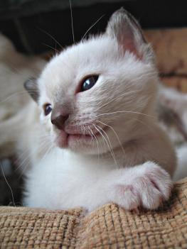 Die Thaikatzen werden weiss geboren. Aber schon nach wenigen Tagen beginnt die Pigmentierung. Die Färbung beginnt an dem Nasenspiegel und den Ohrrändern. Das Thaibaby auf dem Foto rechts